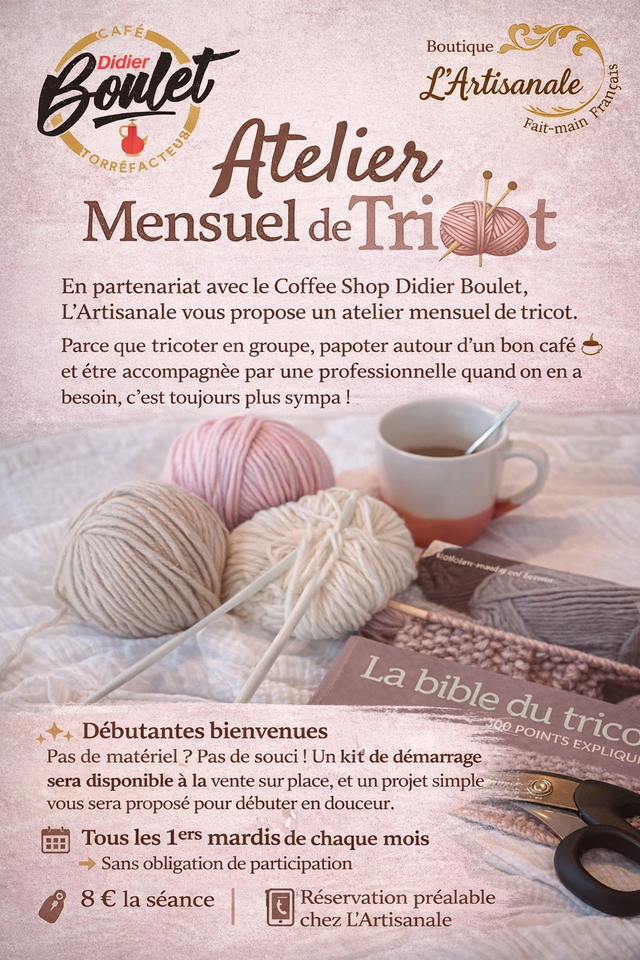 En partenariat avec le Coffee Shop Didier Boulet, L’Artisanale vous invite à un moment créatif et convivial autour du tricot.