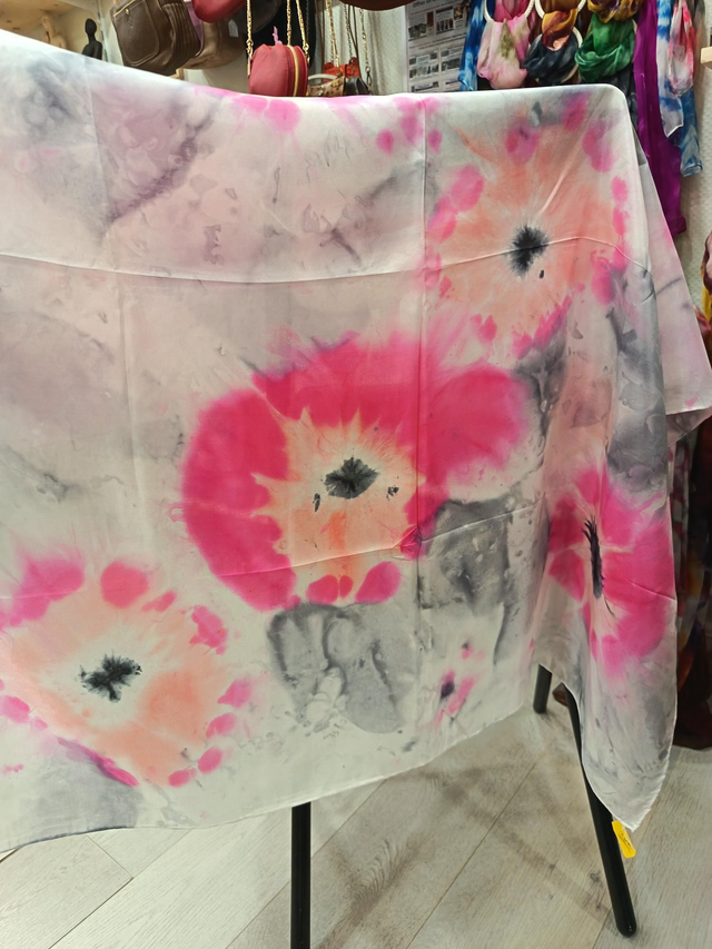 Carré de soie fushia et noir Fleurs Églantine
