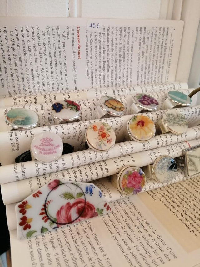 Bague ajustable en acier inoxydable, agrémentée d'un médaillon en faïence de 20mm de diamètre, recouvert de résine.